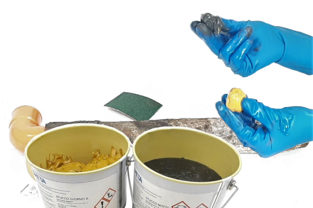 Stucco Giorno Notte è uno stucco epossidico, poliammidico bicomponente e senza solvente, autoadescante, applicabile a mano.